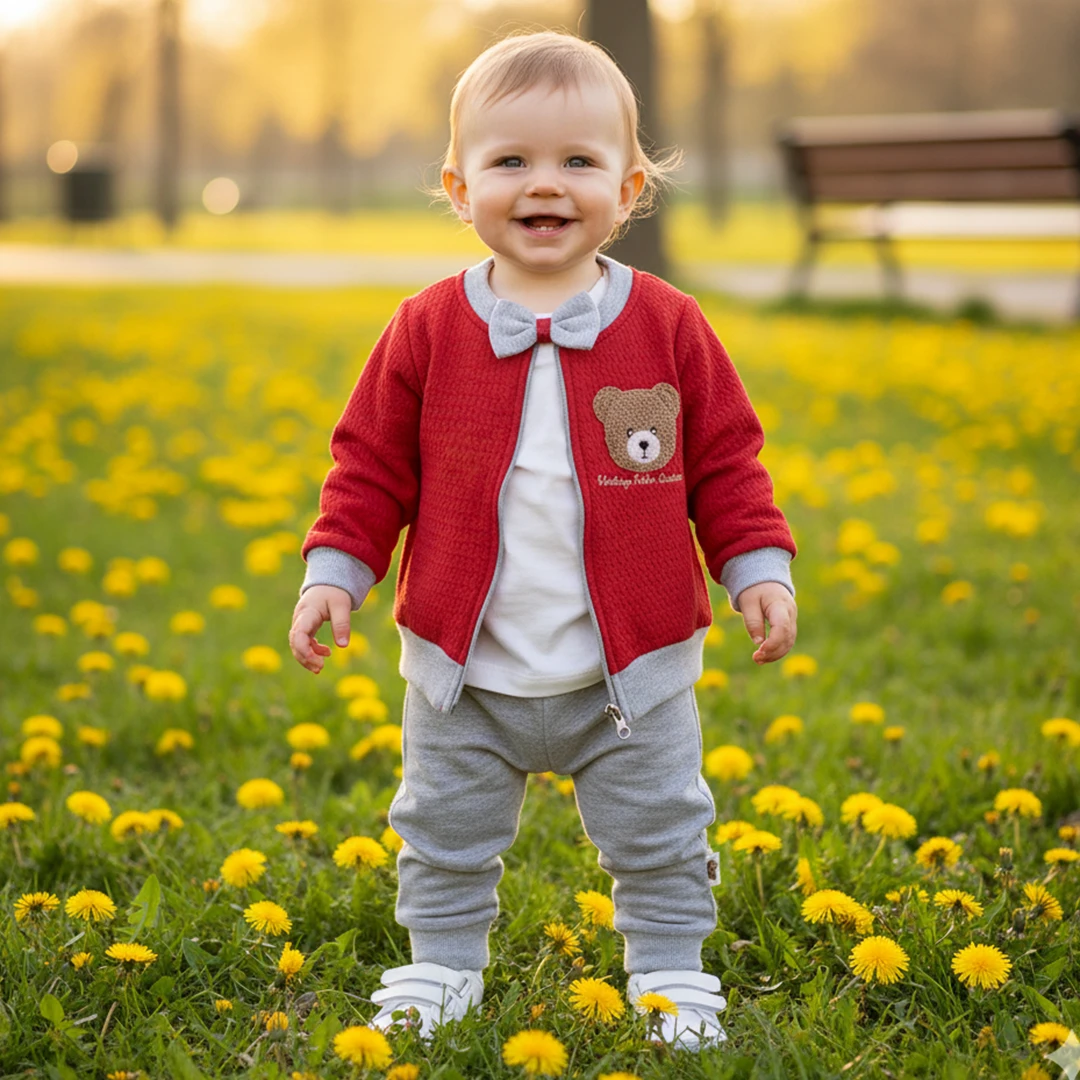 Съдържание на комплекта: Съставен е от елегантен кардиган в наситено червен цвят с очарователна мечешка апликация, подчертан с уютна сива тениска и хармониращи сиви панталони, които са перфектни за игра и отдих.