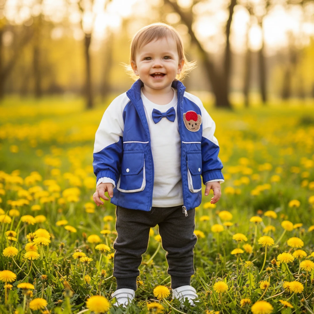 Съдържание на комплекта: Включва стилно синьо яке с практични джобове и сладък апликация на мече, лесен за носене под якето, и удобни сиви панталони, които са перфектни за игра и отдих.