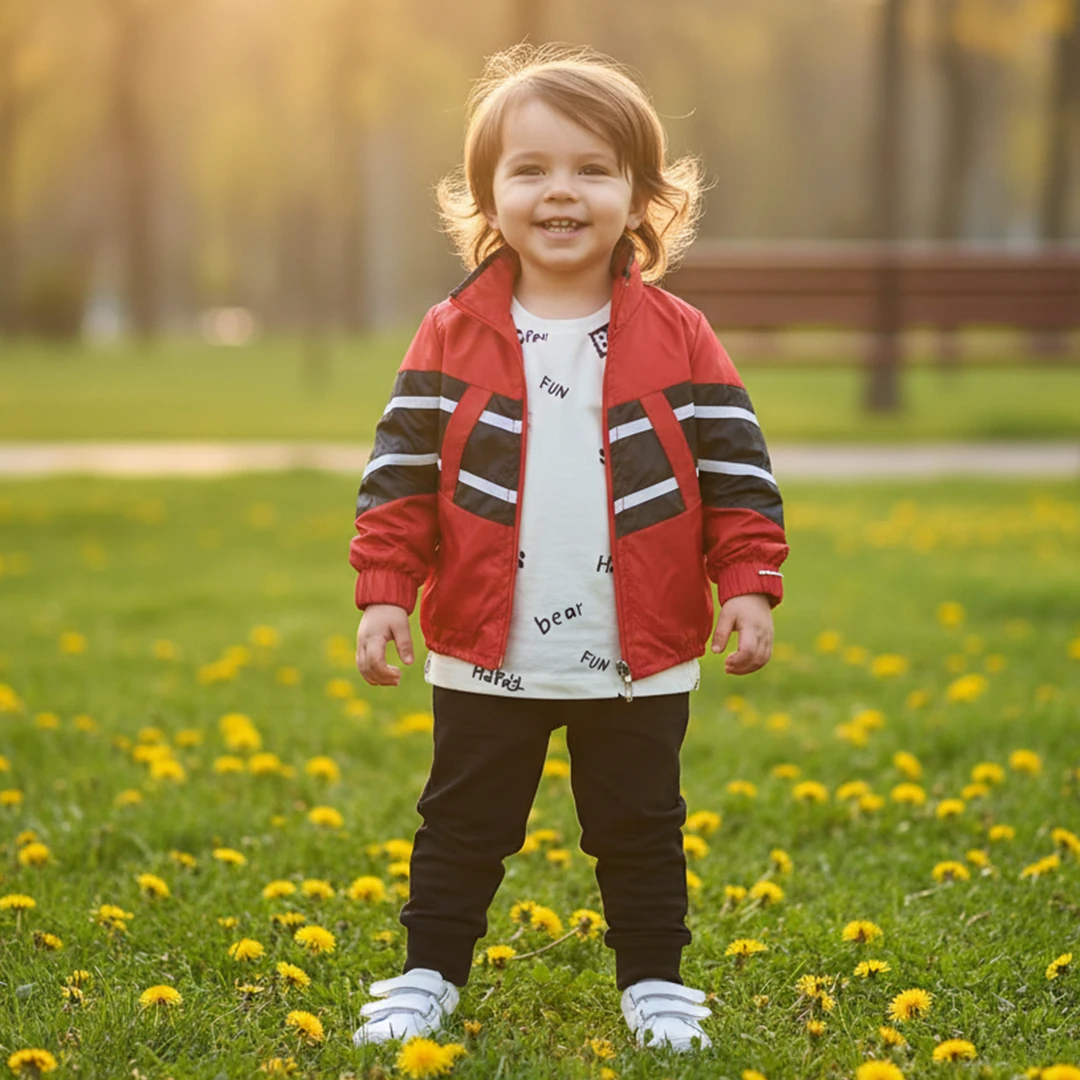 Съдържание на комплекта: Включва ярко червено яке със стилни черно-бели райета за модерен спортен вид, бяла тениска със забавни надписи, и черни панталони, които са универсални и удобни за носене.