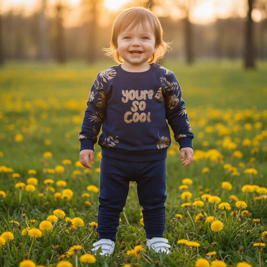 Модерен Дизайн: Блузата е с лека текстура и златист надпис "you're so cool", допълнен от стилни листни акценти. Панталоните в тъмносин цвят са класически и лесно се съчетават с различни тениски и блузи, което ги прави идеални за всекидневието.
