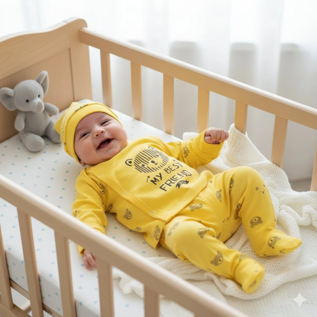 Издръжливост за Игра: Комплектът е създаден да издържи на невероятните бебешки приключения, като е лесен за поддръжка и остава ярък и свеж след всяко пране.