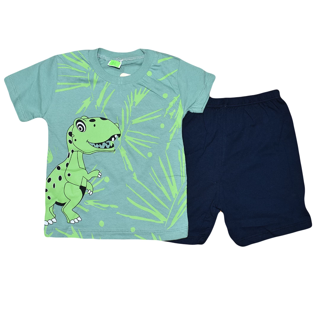 - Комплекта се състои от 2 части: тениска с апликация на динозавър и къси панталноки.