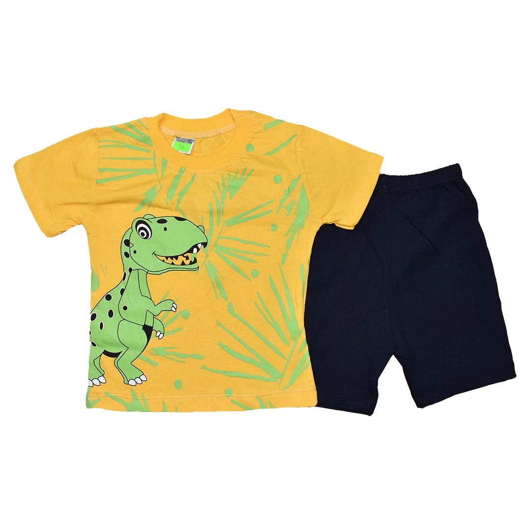 - Комплекта се състои от 2 части: тениска с апликация на динозавър и къси панталноки.