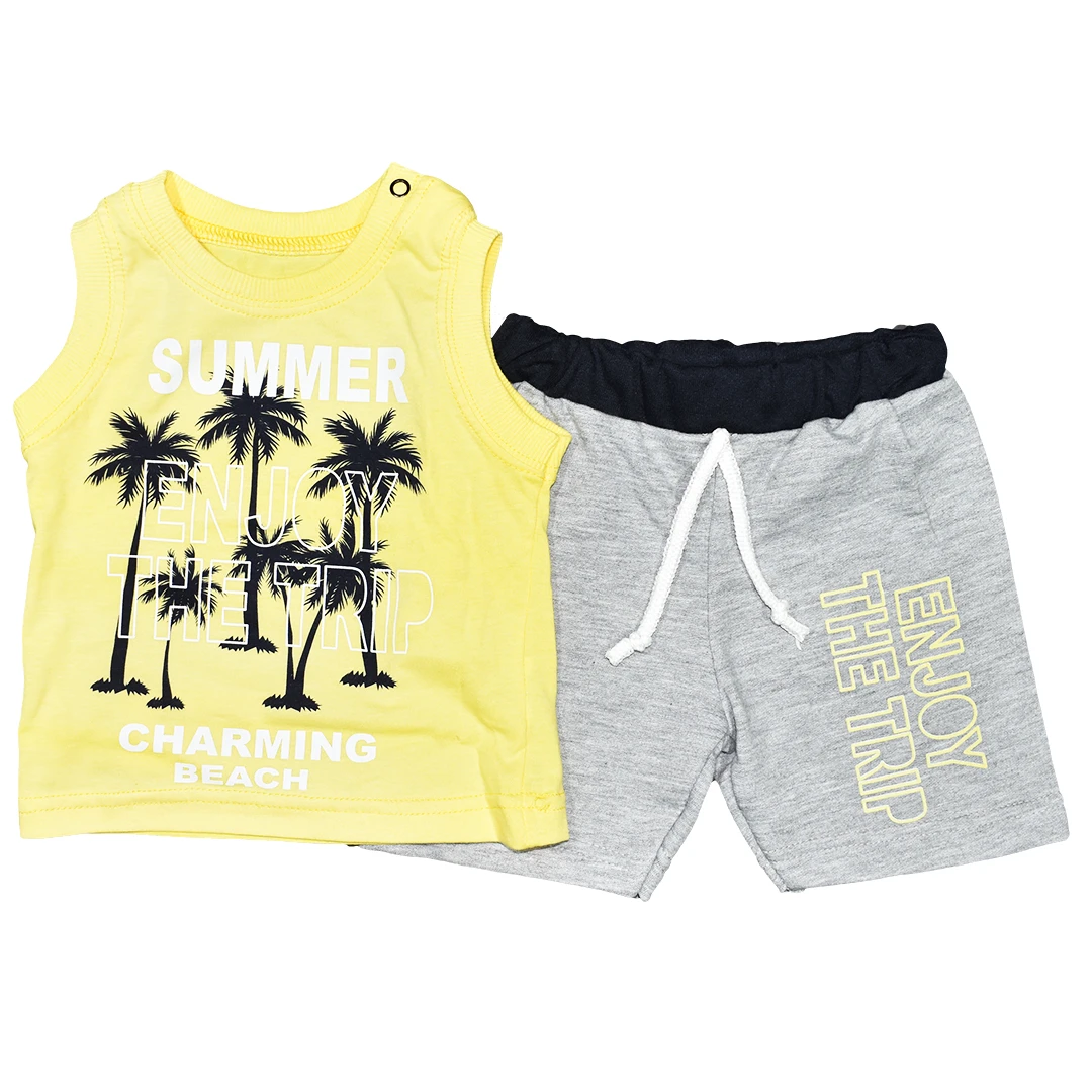 Бебешки комплект за момче с жълт потник с апликация на палми, къси панталонки в светло сиво и черен ластик. Много удобен и подходящ за топлите летни дни. Изработен от 100% памук за максимален комфорт. Произведен в Турция.| Характеристики | |