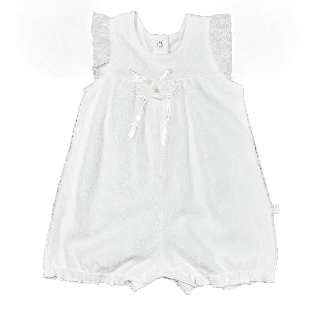 Този прекрасен бебешки летен гащеризон за момиче в бяло е идеално допълнение към гардероба на вашия малък ангел. Изработен е от висококачествен 100% памук, който осигурява комфорт и удобство на детето ви. Този стилен гащеризон е произведен в Турция, гарантирайки високо качество и изящен дизайн.| Характеристики | |