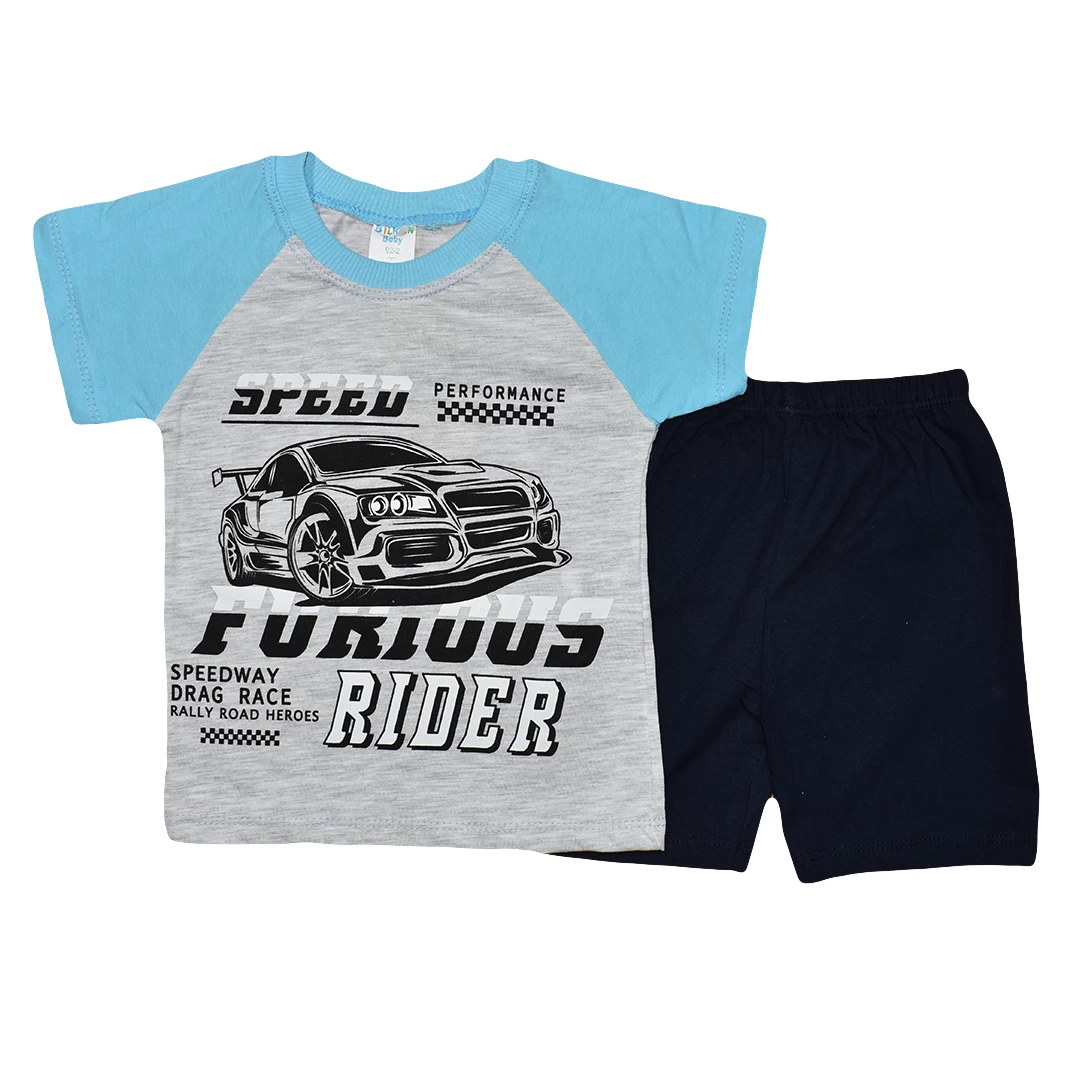 - Памучен бебешки комплект който се състои от 2 части: тениска с апликация на кола и надпис "speed furies rider" и къси панталнки