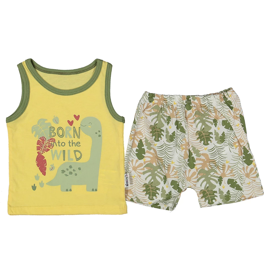 Комплекта включва къси панталонки, тениска изработени от фин и мек памук.