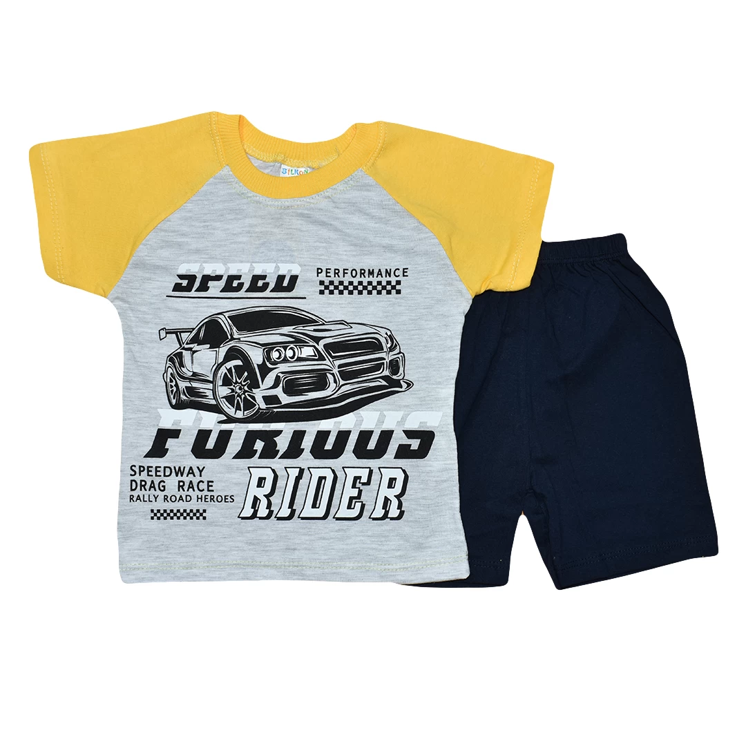 - Памучен бебешки комплект който се състои от 2 части: тениска с апликация на кола и надпис "speed furies rider" и къси панталнки