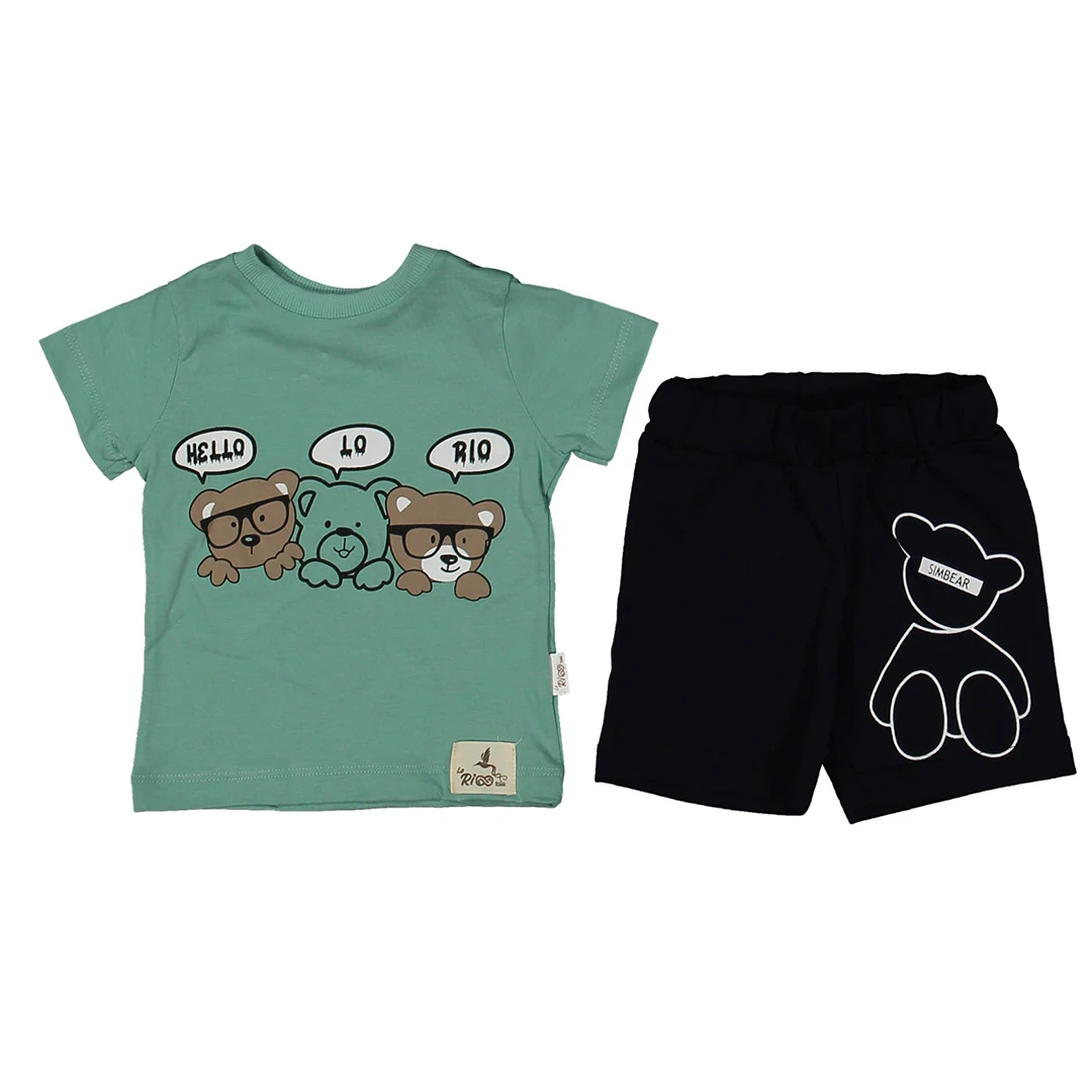 Бебешки летен комплект за момче от 2 части с тениска в зелено и апликация с мечета, комбинирани с къси панталони в черно и апликация с мече. Изработен от 100% памук, произведен в Турция.| Характеристики | |