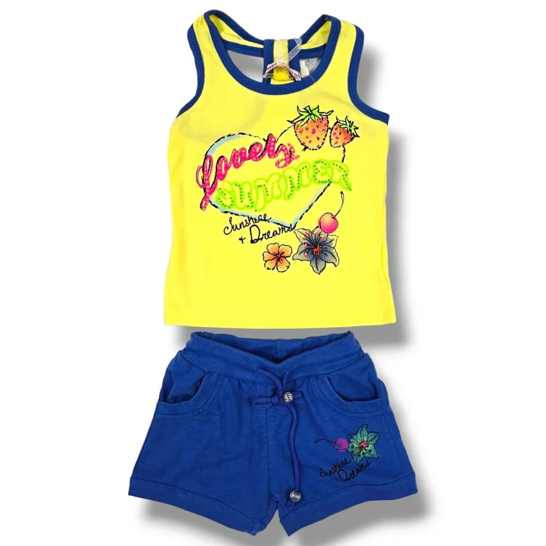 Този прекрасен комплект за момиче е идеален за летните дни. Изработен е от 100% памук, който осигурява комфорт и удобство. Комплектът е произведен в Китай и е подходящ за ежедневно носене или за по-специални поводи. С него вашият малчуган ще изглежда стилно и сладко.| Характеристики | |
