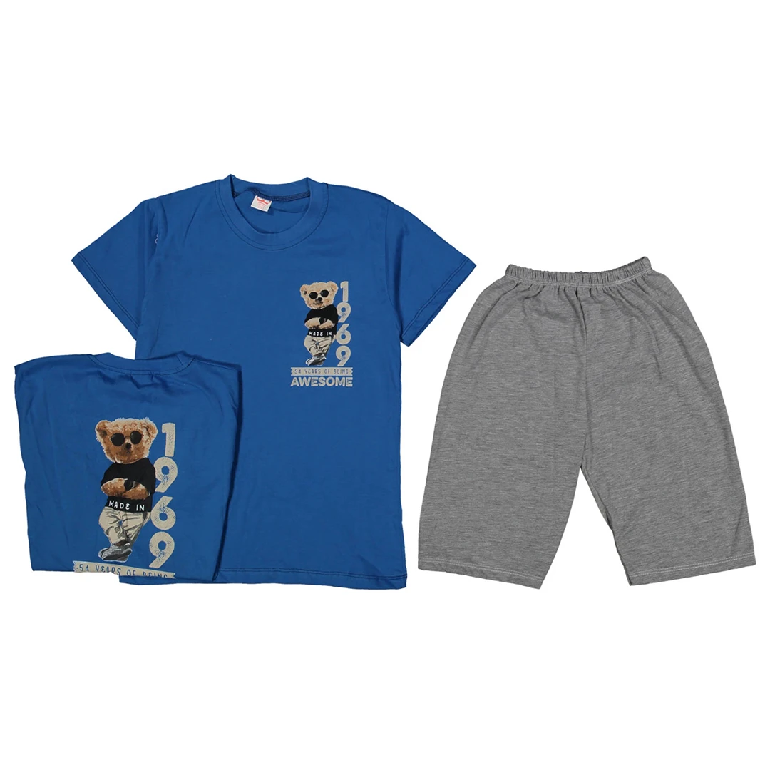 Този комплект включва тениска в синьо с мечок както на гърба, така и отпред, комбинирана с къси панталонки в сиво. Изработен е от 100% памук и е подходящ за летните дни. Произведен е в Турция.| Характеристики | |