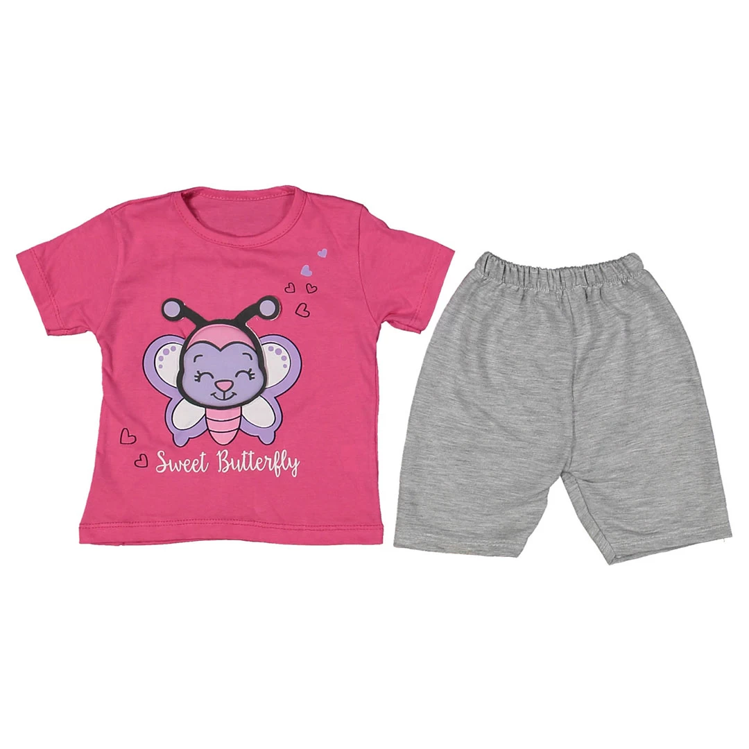 Представяме ви нашия чаровен бебешки летен комплект за момиче от 2 части. Този комплект е създаден със забележителна комбинация от цветове и дизайн, предназначен да направи вашето малко слънце още по-сладко и привлекателно. Включва тениска в цикламено с голяма пеперуда и къси панталонки в светло сиво.