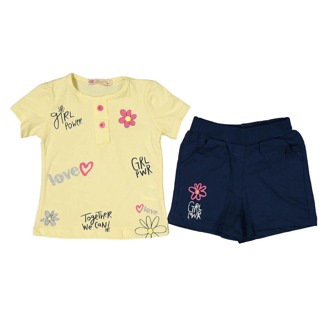 Слънчев летен комплект за момиче - Жълта тениска с цветя и надписи, тъмносини къси панталонки с картинка на цвете