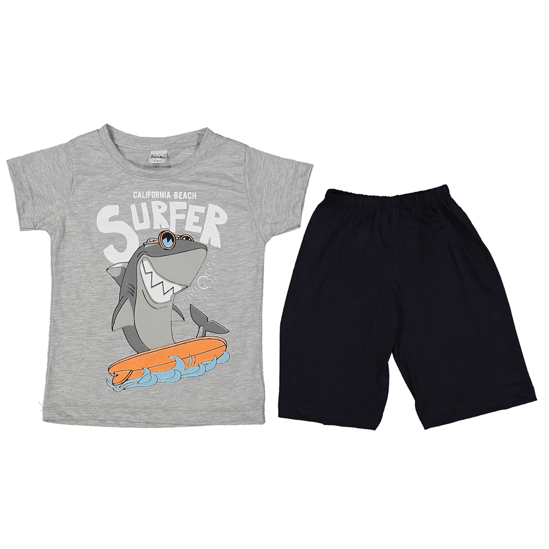 В комплекта ще откриете тениска в сиво, с апликация на акула сърфист и надпис "SURFER". Тези динамични елементи придават на тениската игрив и модерен вид, който ще впечатли вашето момче. Той ще се почувства като истински сърфист, готов да се освободи във вълните и да създаде своя собствен стил на плажа.