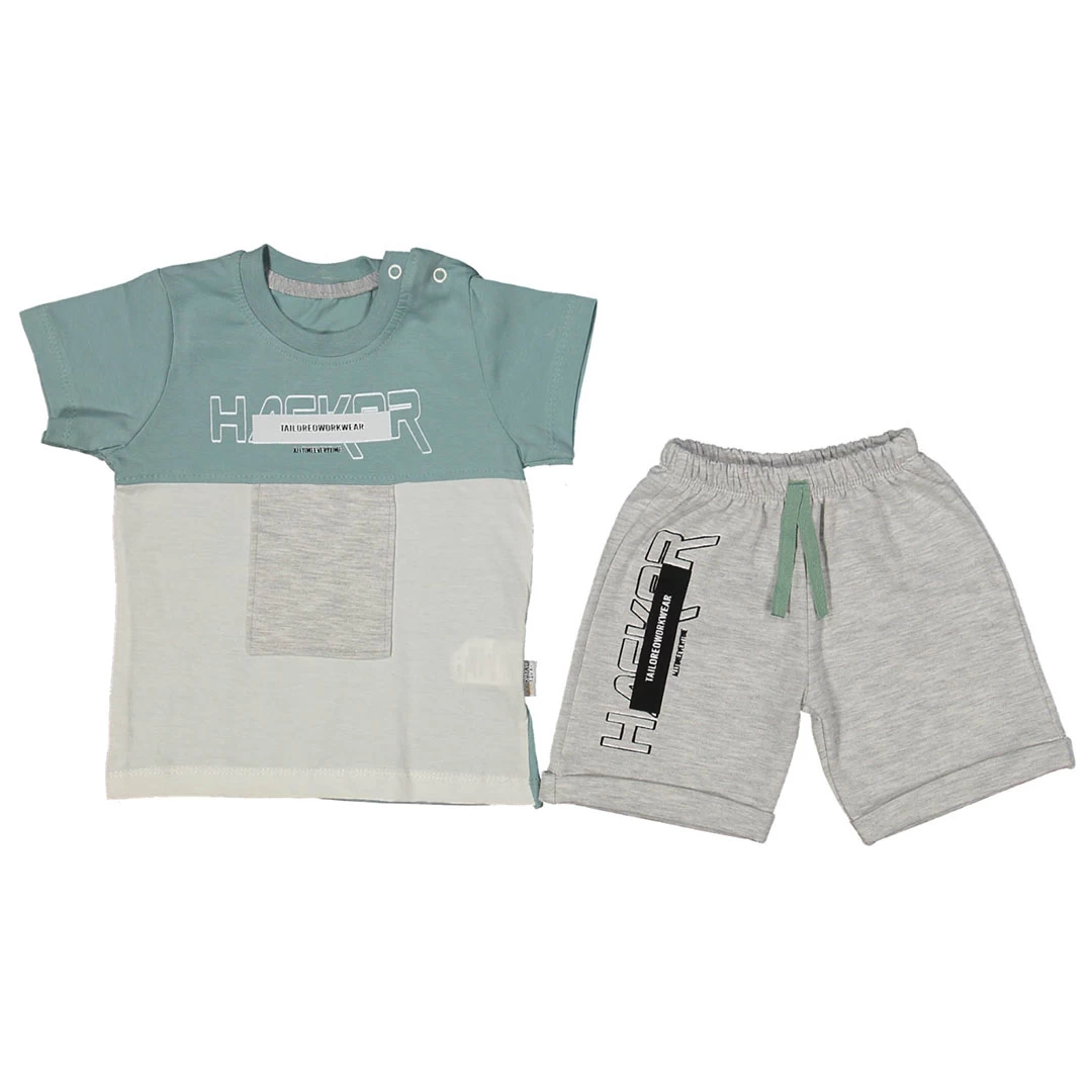 Добре дошли в нашия онлайн магазин за бебешки дрехи! Представяме ви стилен бебешки летен комплект за момче, който съчетава комбинация от цветове и надписи, осигурявайки уникален стил и комфорт.