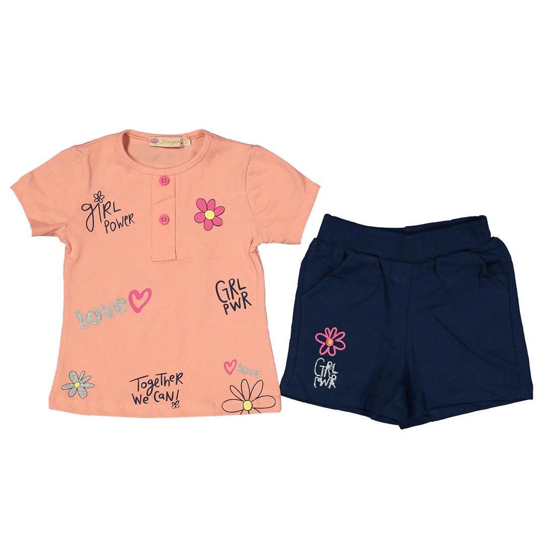 Представяме ви нашия стилен летен комплект за момиче, който ще донесе нежност и модерен вид към гардероба на вашата малка принцеса. Този комплект включва кремава тениска с прекрасни цветя и надписи, заедно с тъмносини къси панталонки с картинка на цвете.