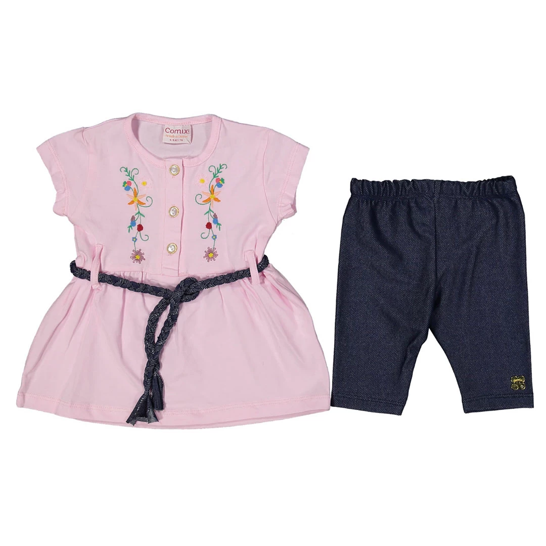Страхотен бебешки летен комплект за момиче - Туника в розово с цветни детайли и изчистен тъмен клин
