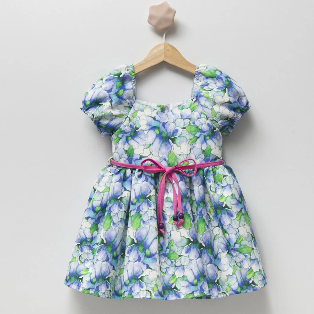 - Красива памучна детска лятна рокля с красив десен на цветя с връзка на кръста.
