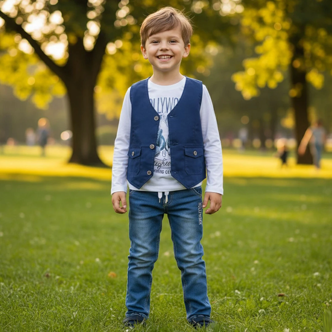 Този детски комплект включва дънки, блузка и елече, изработени от 100% памук за комфортно и удобно обличане на Вашето дете. Идеален за всекидневно носене или специални поводи. Произведен в Китай.| General | |