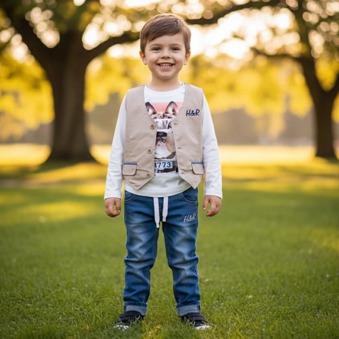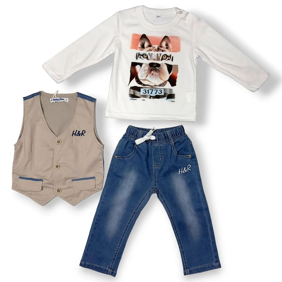 Този детски комплект включва дънки, блузка и елече, изработени от 100% памук за комфортно и удобно обличане на Вашето дете. Идеален за всекидневно носене или специални поводи. Произведен в Китай.| General | |