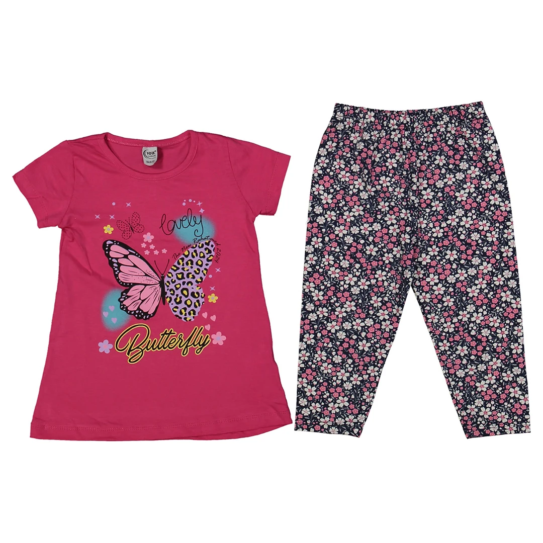Детския летен комплект включва цикламена тениска с апликация на пеперуда и клинче с цветни детайли. Изработен е от 100% памук и е произведен в Турция. Идеален избор за свежо и комфортно облекло по време на горещите летни дни.| Характеристики | |