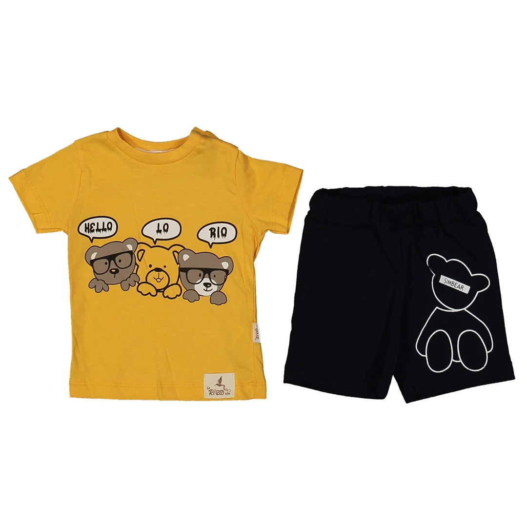 Детският летен комплект за момче включва тениска в жълто с апликация на мечета и къси панталонки в черно с апликация на мече. Изработен е от 100% памук и е произведен в Турция. Този комплект е подходящ за децата ви през летните дни.| Характеристики | |