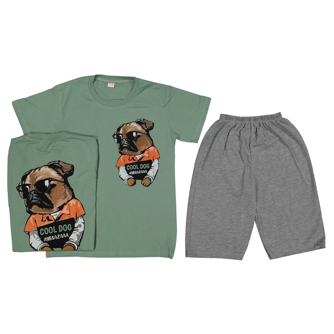 Този прекрасен летен комплект за момче е идеалният избор за горещите летни дни. Включва светло зелена тениска с апликация на куче и къси сиви панталонки. Изработен е от 100% памук, който осигурява комфорт през целия ден. Произведен в Турция.| Характеристики | |