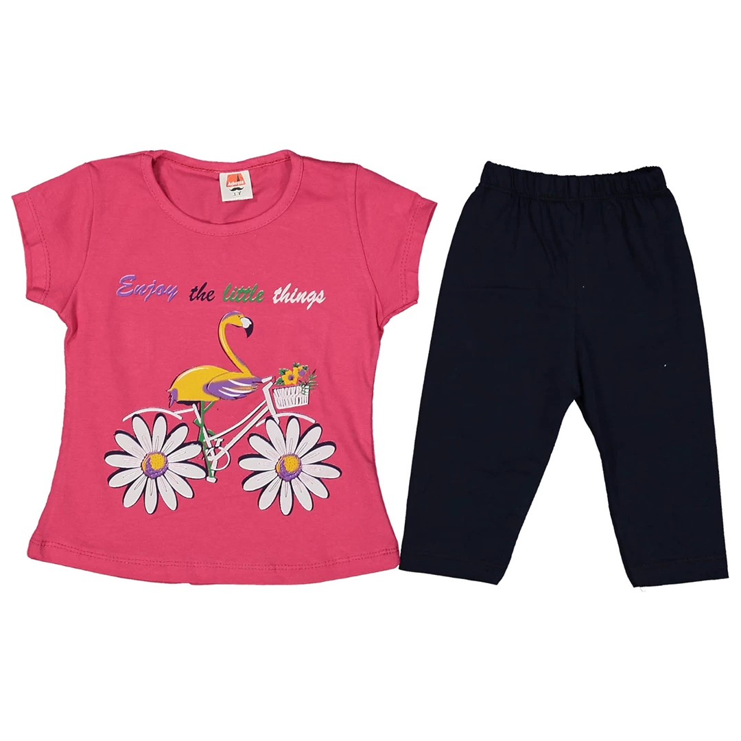 Детски летен комплект за момиче с фламинго на колело в циклама