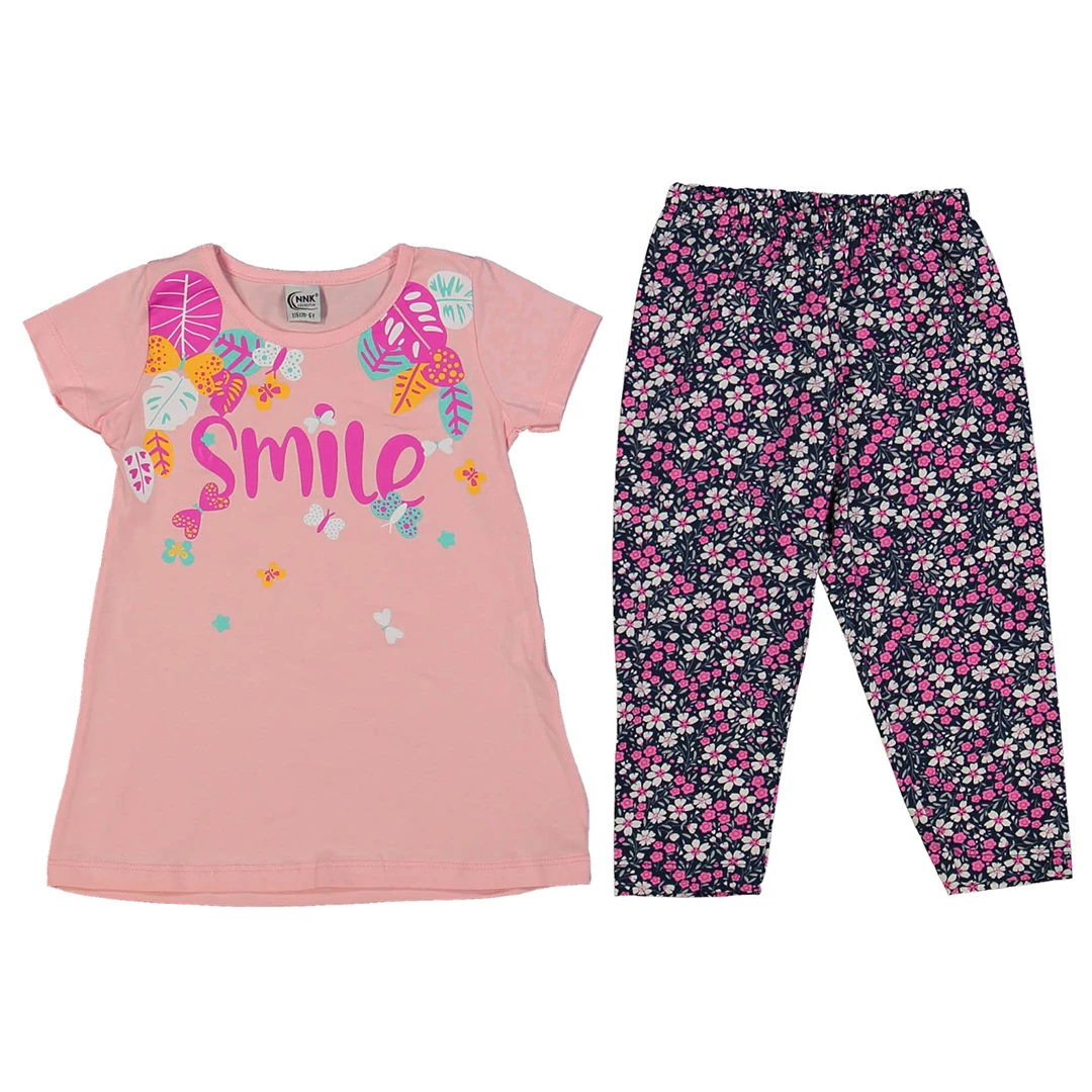 Този чудесен летен комплект за момиче включва туника в розово с надпис Smile и поеперуди и клин на цветя. Изработен е от 100% памук, който осигурява удобство и комфорт през горещите летни дни. Произведен е в Турция и предлага стил и качество на достъпни цени.| Характеристики | |