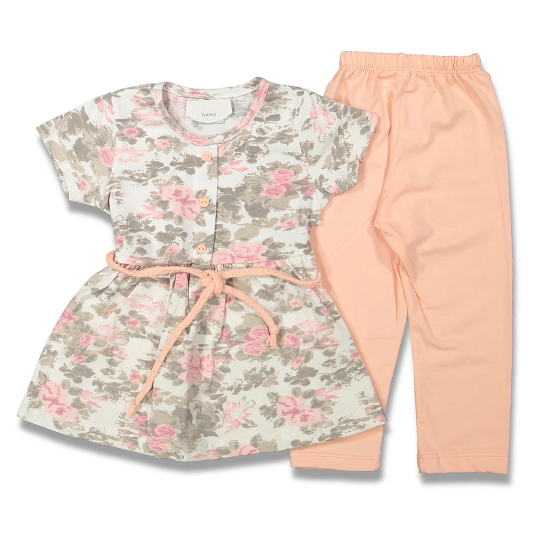 Детският летен комплект за момиче включва туника на розички с връзка през кръста и кремав клинче. Изработен е от 100% памук, което го прави удобен за носене през горещите летни дни. Този комплект е подходящ за разходки по плажа или за игри на открито. Стилна и удобна дреха за малките дами. Произведен в Турция.| Характеристики | |