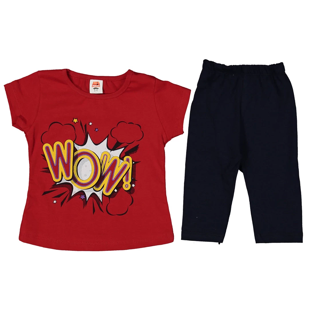 - Комплекта се състои от 2 части: Бяла тениска с картинка WOW и 7/8 клин изработени от финна и мека памучна материя