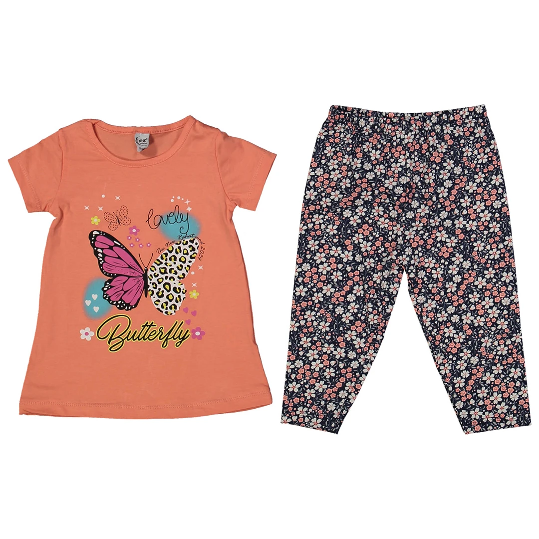 Детски летен комплект за момиче в оранжево с апликация на пеперуда на тениската и клинче на цветя. Изработен от 100% памук. Прекрасен избор за горещите летни дни. Произведен в Турция.| Характеристики | |