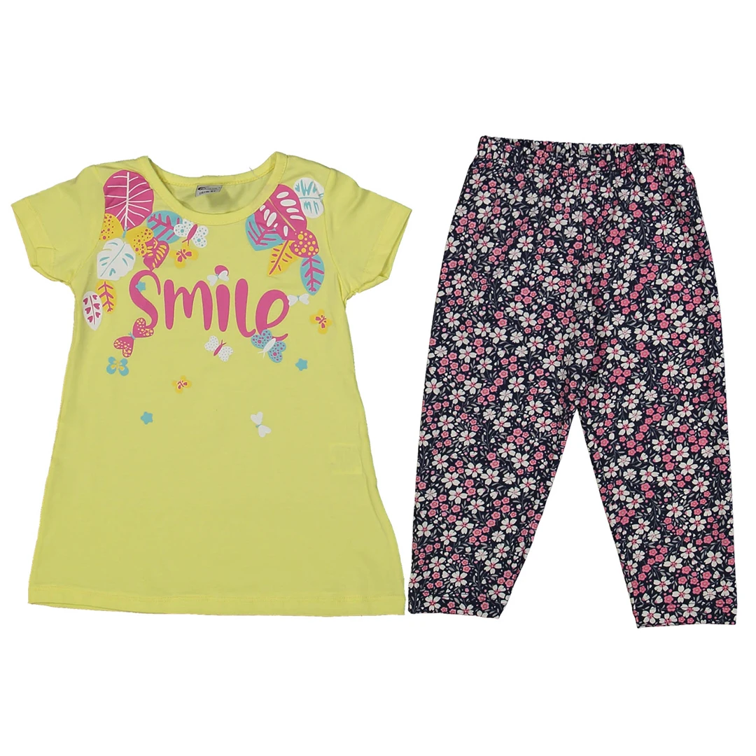 Този прекрасен летен комплект за момиче включва тениска в жълт цвят с надпис "Smile" и клин с цветен десен. Изработен е от висококачествен 100% памук, осигурявайки комфорт през горещите летни дни. Идеален за разходки в парка или игри на пясъчника. Произведен с внимание към всекидневието на децата, този комплект е перфектният избор за стил и удобство.| Характеристики | |