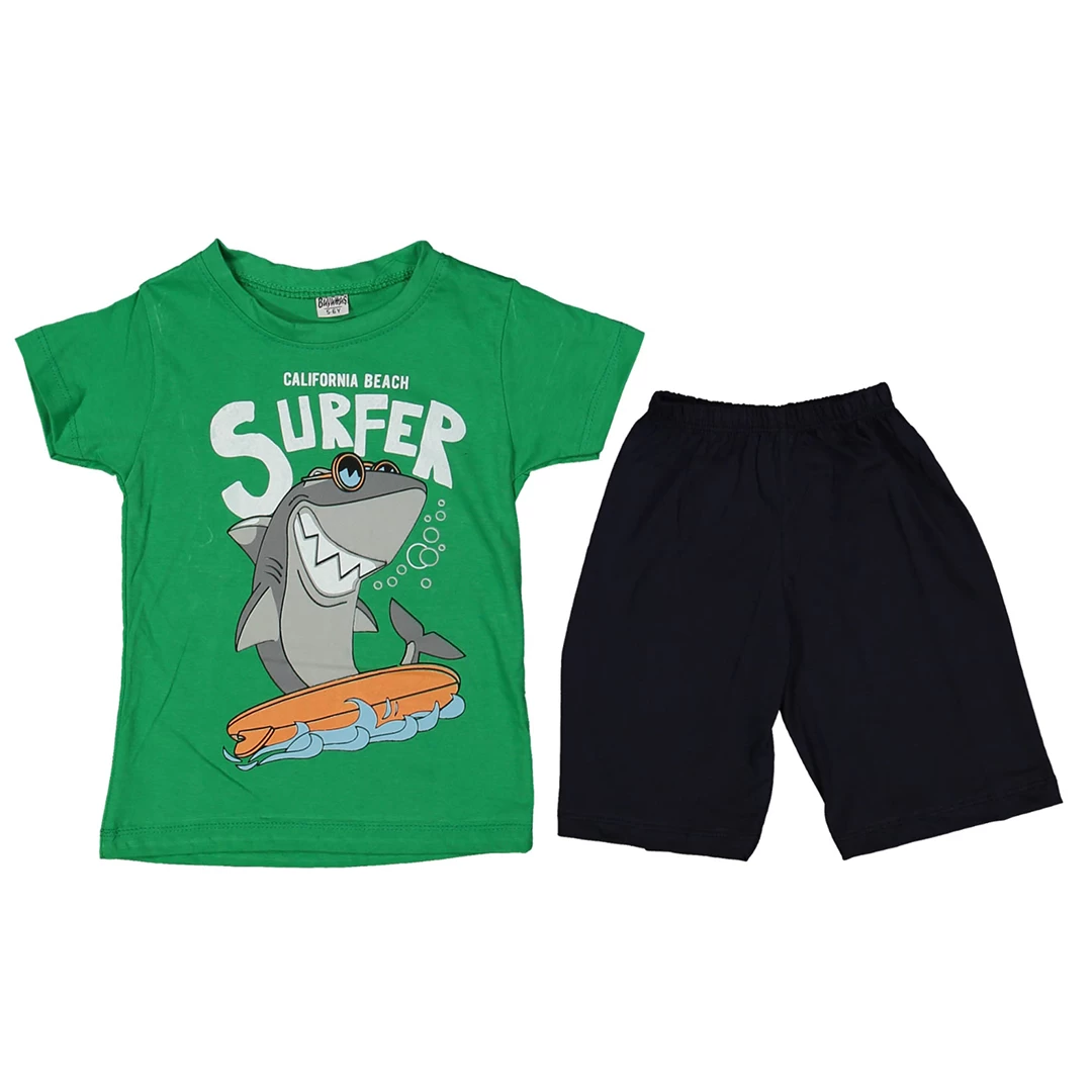 В комплекта ще откриете тениска в наситено зелено, с апликация на акула сърфист и надпис "SURFER". Тези динамични елементи създават атмосфера на безгрижие и страст към водата. Вашето момче ще се почувства като истински сърфист, готов да завладее вълните и да изживее незабравими моменти на плажа.