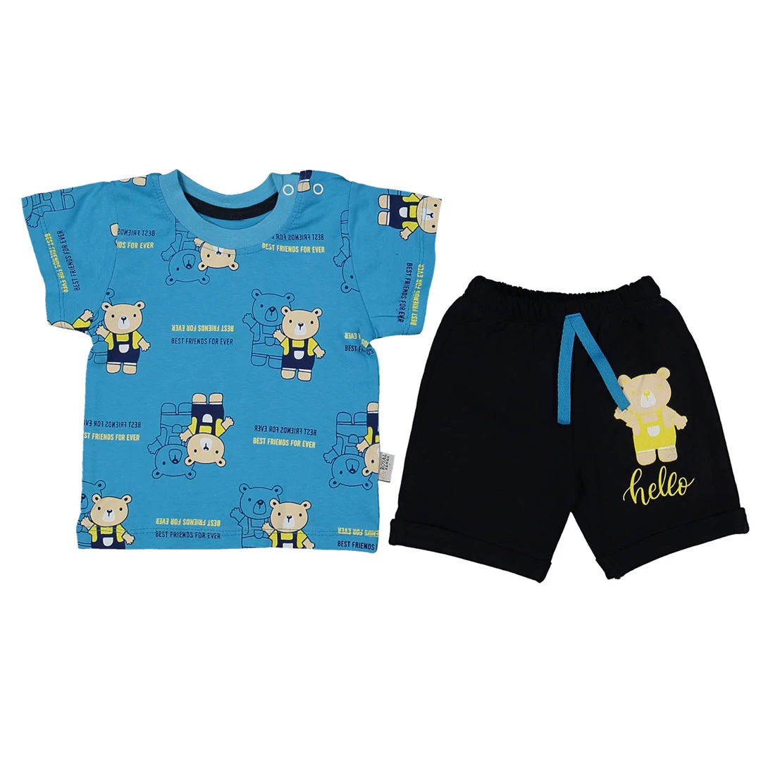 Представяме ви нашия бебешки комплект за момче, който съчетава мекота и качество на най-достъпна цена. Този комплект от две части включва синя тениска с апликация на мечета и черни къси панталонки със същата апликация.