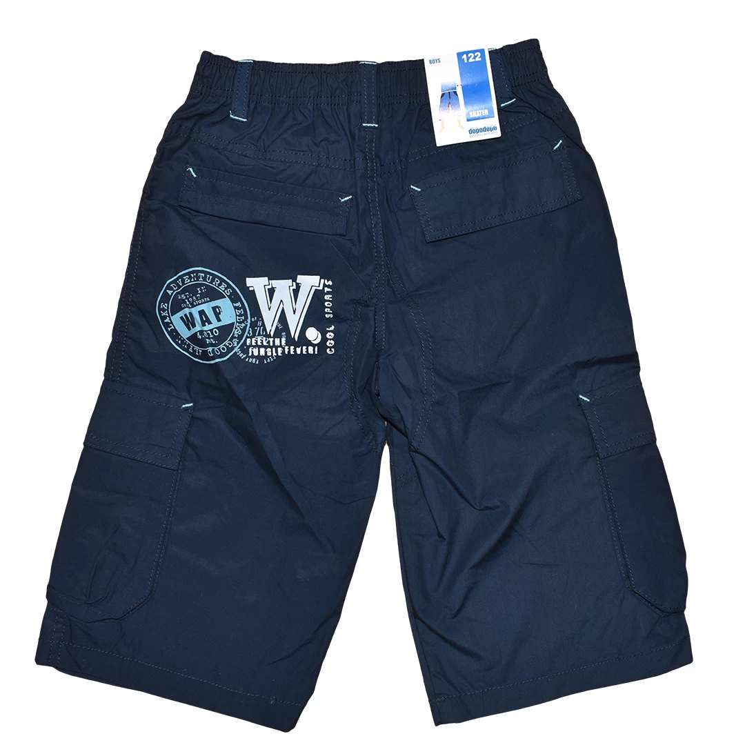 - Къси детски панталони за момче в тъмно синьо с джобове и ластик.