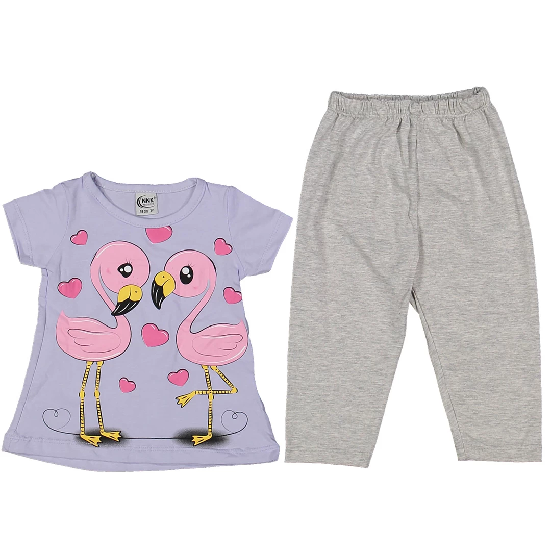 Летен детски комплект за момиче с фламинги в лилаво
