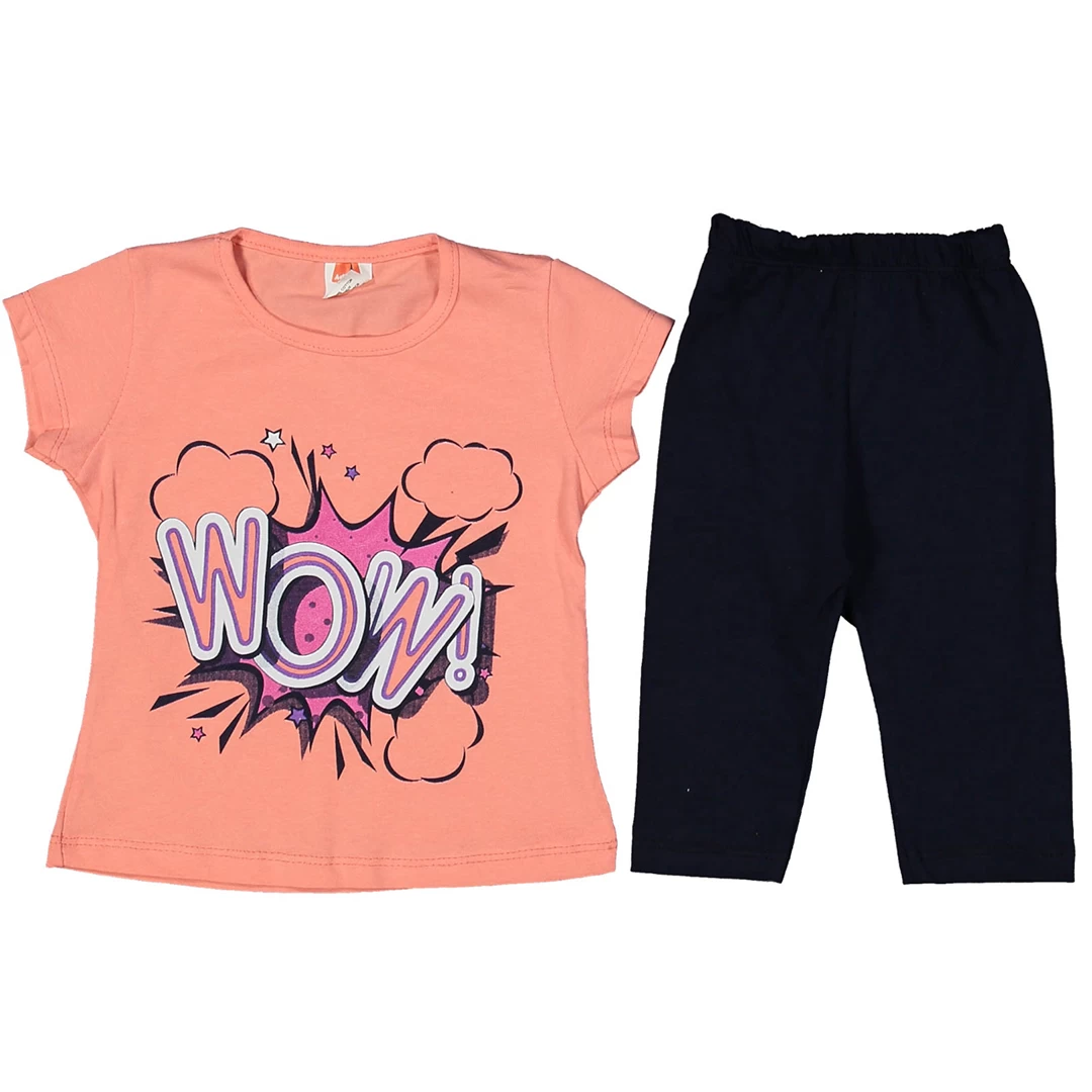 - Комплекта се състои от 2 части: Бяла тениска с картинка WOW и 7/8 клин изработени от финна и мека памучна материя