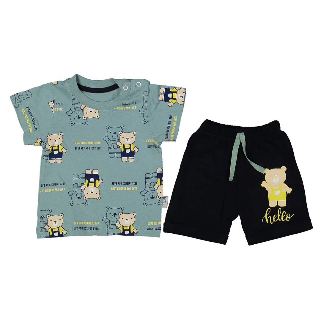 редставяме ви нашия уникален бебешки комплект за момче, който комбинира стил и комфорт. Този комплект от две части включва тениска в маслено зелен цвят с апликация на мечета и черни къси панталонки със същата апликация.