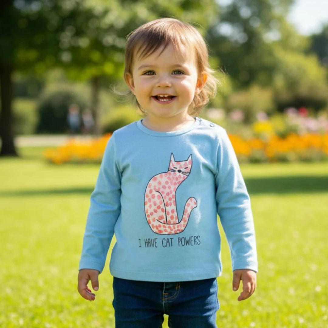 Суперкотешки Чар: Тази бебешка блузка за момиче пленява със своята игрива графика на котка и забавния надпис "I HAVE CAT POWERS", който добавя една щипка вълшебство към ежедневието.