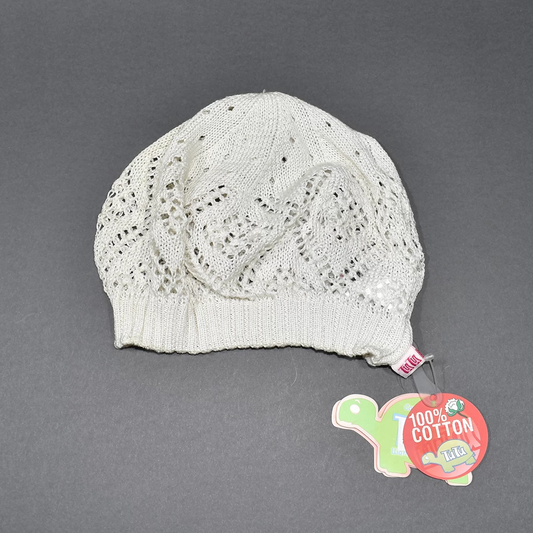 Нежна бебешка шапка за момиче - Фино памучно плетиво на дупчици в бяло