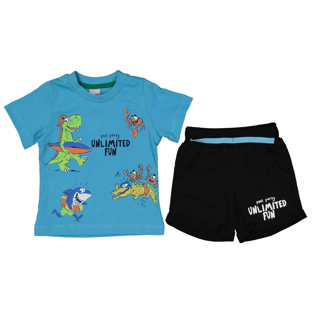Зелената тениска е украсена със забавна апликация на акула, динозавър, раци и крокодил, които създават игрив и стилен вид на комплекта. Тениската е изработена от 100% памук, осигурявайки мекота и комфорт през горещите летни дни.