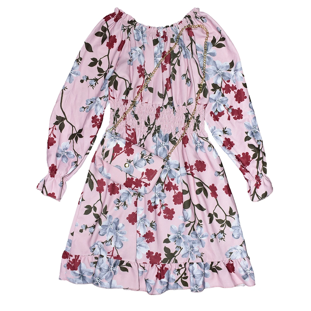 Розовата основа на роклята е оживена с красиви флорални украшения в синьо и червено, които придават свежест и жизненост на визията. Дългите ръкави и еластичният крой около кръста осигуряват удобство за непрекъсната игра и забавление, а воланът на подгъва добавя финално докосване на милост.