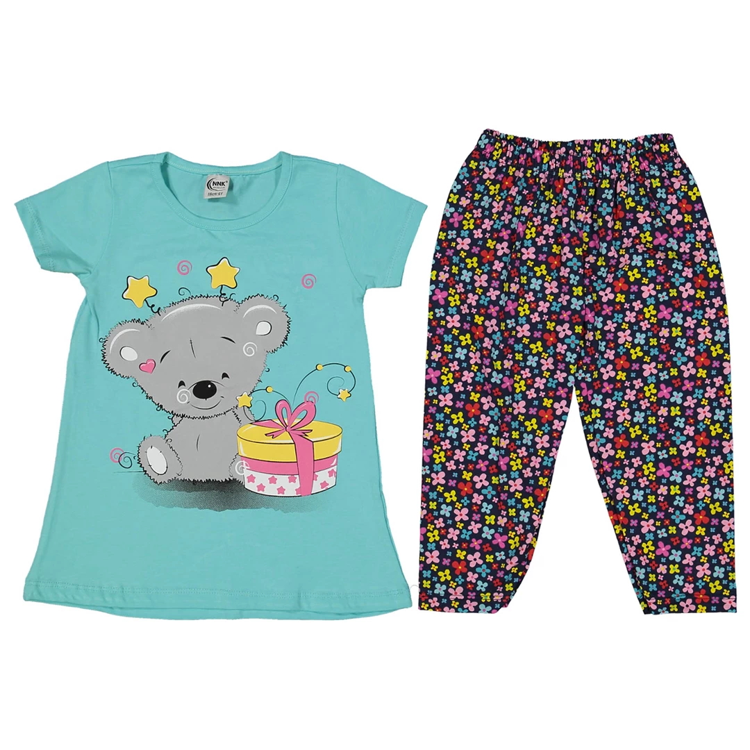 Представяме ви нашия чудесен летен комплект за момиче, който ще добави радост и цветове към гардероба на вашата малка принцеса. Тениската в синьо-зелено е весела и свежа, а апликацията на усмихнат коала, държащ подарък, ще впечатли всички със своята сладост.