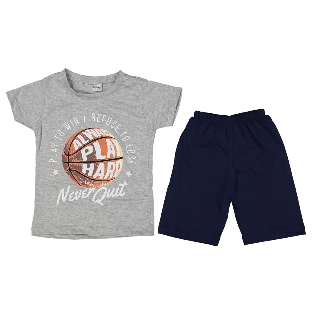 Добре дошли в нашия онлайн магазин за детски дрехи! Представяме ви нашия удобен и стилен детски комплект за момче от 2 части в сиво и тъмно синьо. Този комплект е идеален избор за вашето активно и модерно момче. Включва тениска в сиво с апликация на баскетболна топка и надписи, както и къси панталонки в тъмно синьо изчистени.