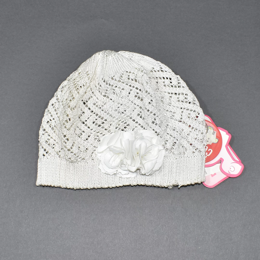Уникална бебешка шапка за момиче - Фино памучно плетиво на дупчици с 3D цветенце в бяло