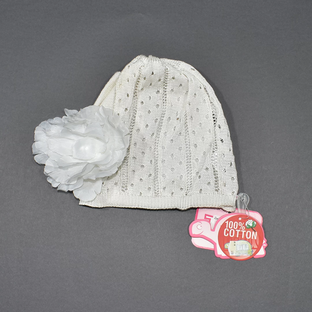 Уникална бебешка шапка за момиче - Фино памучно плетиво на дупчици с 3D цветенце в бяло