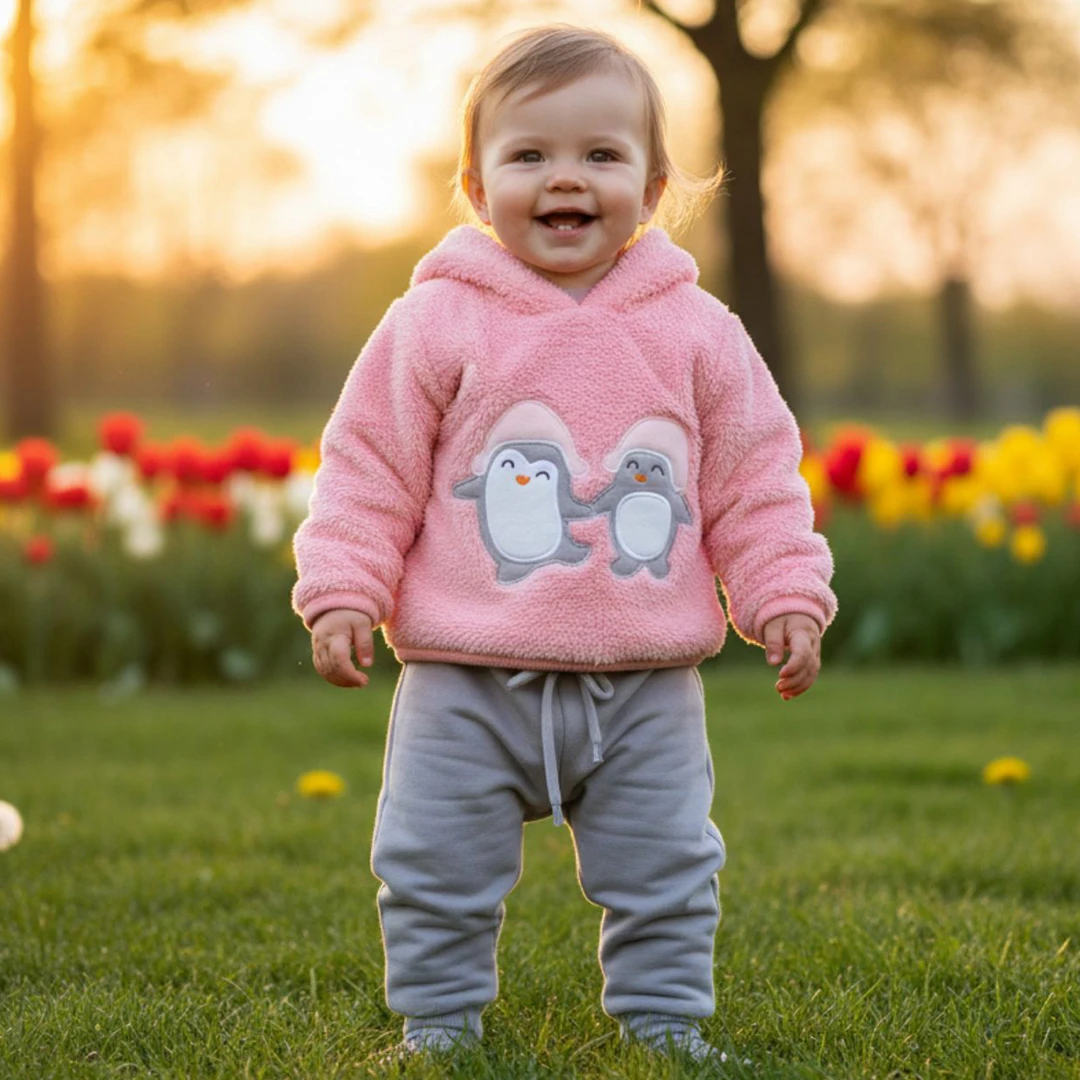 Нашият луксозен ватиран бебешки комплект в розово ще запленително обгърне вашето малко момиченце с нежност и топлина през студените дни. Блузката е снабдена с качулка, която предлага допълнителна защита от студа и стил същевременно. Картинката на сладки пингвинчета със своите ярки цветове и игривост допринася за усещането за радост и веселие.