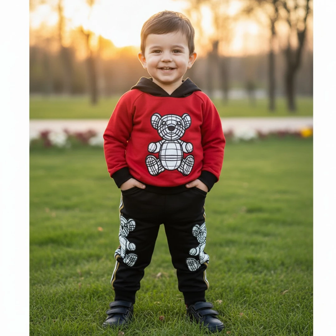 Освежете гардероба на вашето дете с този живописен и забавен детски екип. С красиво червено горнище, украсено с контрастен мече принт и стилни черни и златни ленти, този комплект е идеален за динамичните дни на игра и изследване.